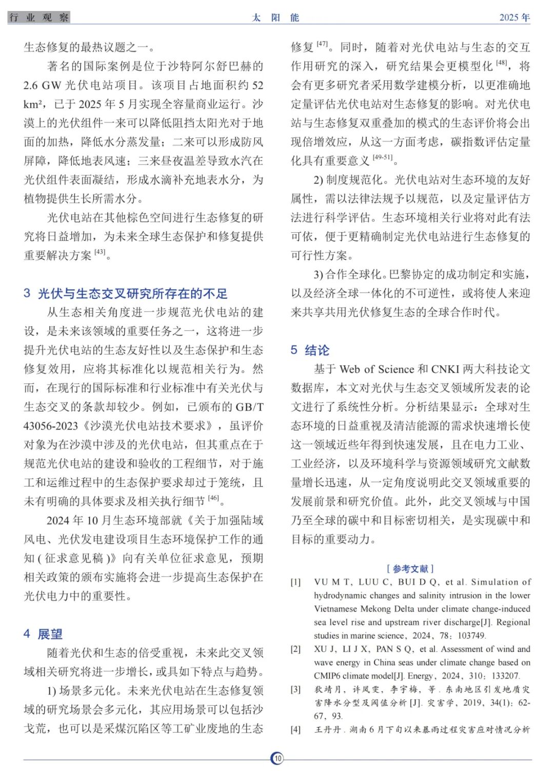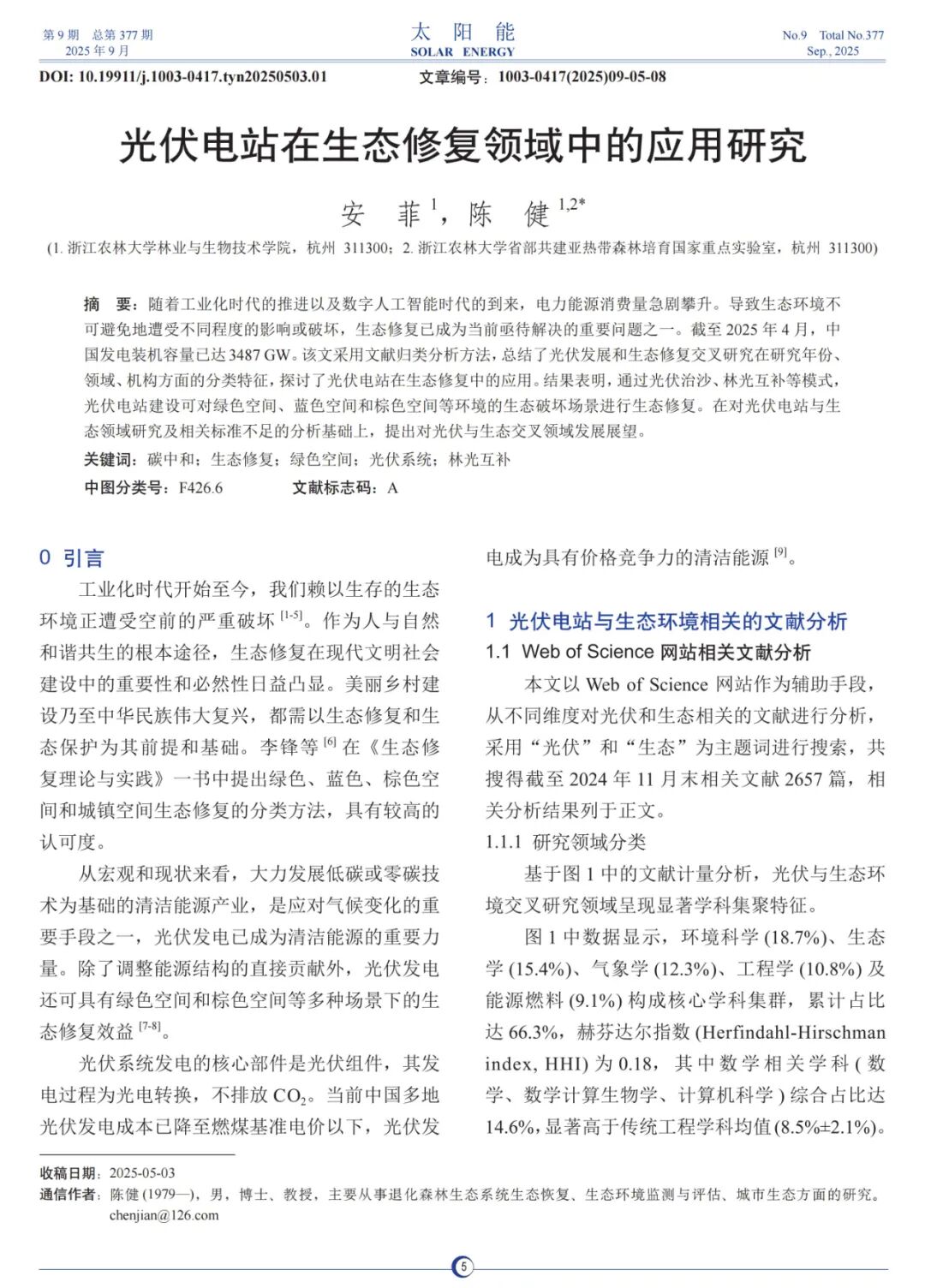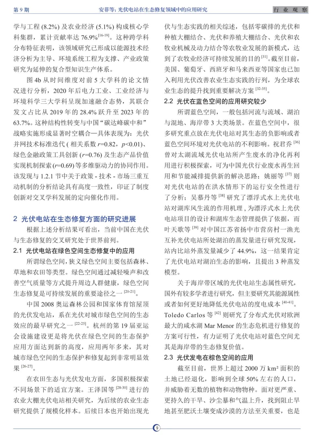 摘 要:随着工业化时代的推进以及数字人工智能时代的到来,电力能源消费量急剧攀升。导致生态环境不可避免地遭受不同程度的影响或破坏,生态修复已成为当前亟待解决的重要问题之一。截至2025 年4 月,中国发电装机容量已达3487 GW。该文采用文献归类分析方法,总结了光伏发展和生态修复交叉研究在研究年份、领域、机构方面的分类特征,探讨了光伏电站在生态修复中的应用。结果表明,通过光伏治沙、林光互补等模式,光伏电站建设可对绿色空间、蓝色空间和棕色空间等环境的生态破坏场景进行生态修复。在对光伏电站与生态领域研究及相关标准不足的分析基础上,提出对光伏与生态交叉领域发展展望。