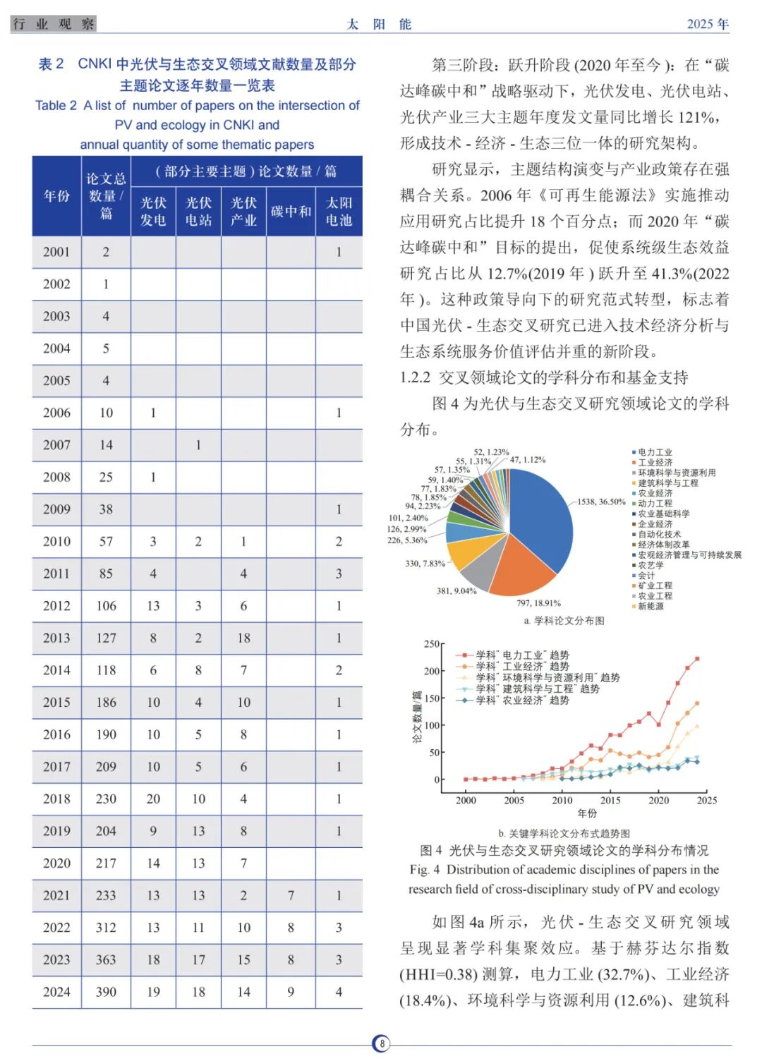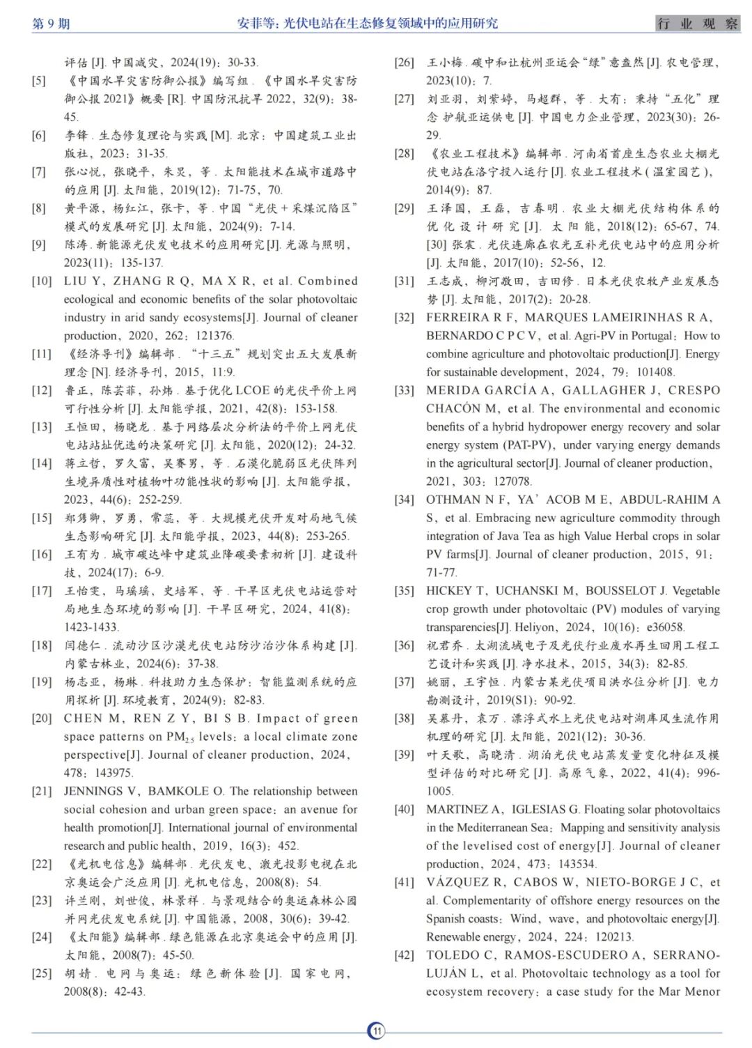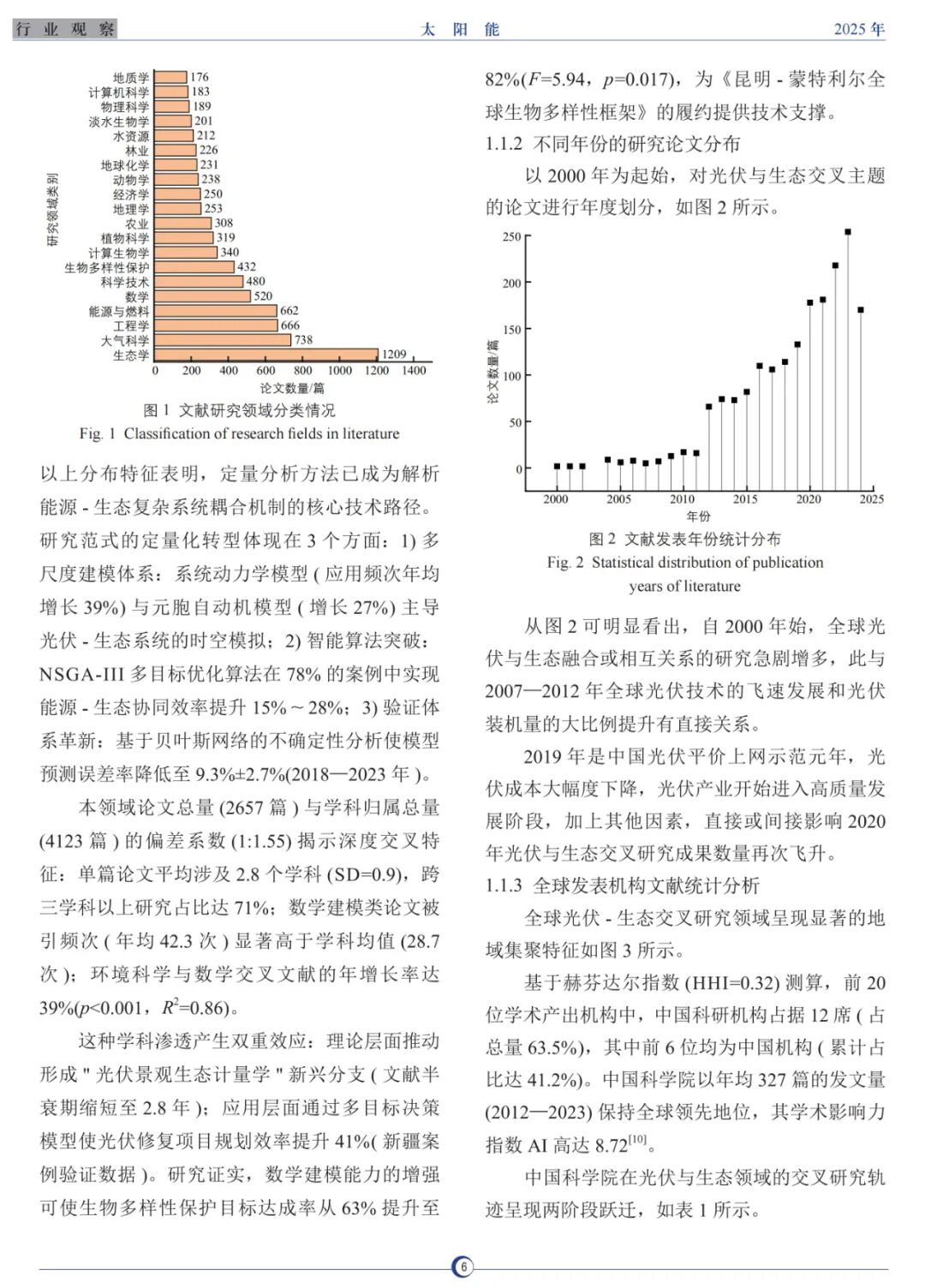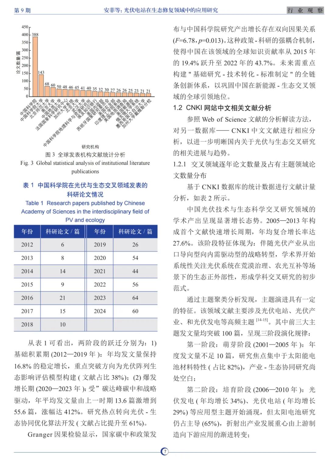 摘 要:随着工业化时代的推进以及数字人工智能时代的到来,电力能源消费量急剧攀升。导致生态环境不可避免地遭受不同程度的影响或破坏,生态修复已成为当前亟待解决的重要问题之一。截至2025 年4 月,中国发电装机容量已达3487 GW。该文采用文献归类分析方法,总结了光伏发展和生态修复交叉研究在研究年份、领域、机构方面的分类特征,探讨了光伏电站在生态修复中的应用。结果表明,通过光伏治沙、林光互补等模式,光伏电站建设可对绿色空间、蓝色空间和棕色空间等环境的生态破坏场景进行生态修复。在对光伏电站与生态领域研究及相关标准不足的分析基础上,提出对光伏与生态交叉领域发展展望。